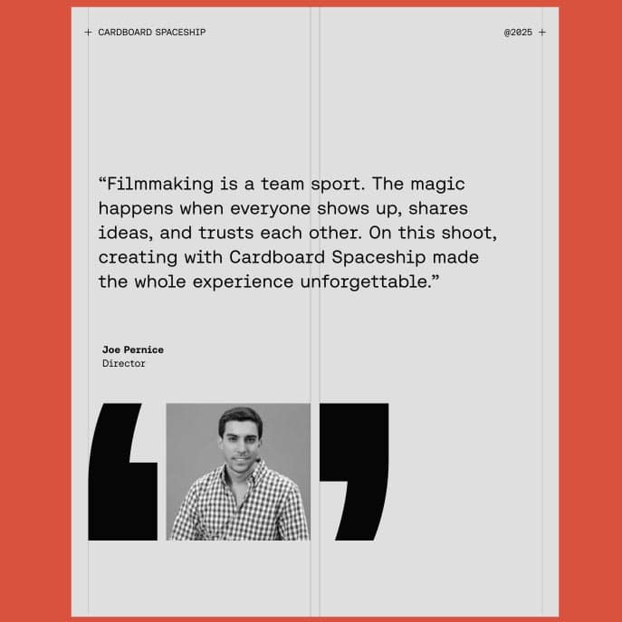The campaign was produced by Cardboard Spaceship and directed by Joe Pernice, with cinematography by David Kruta. The shoot was led by Head of Production, Michael Sapienza, whose calm approach kept the day moving while supporting everyone involved.